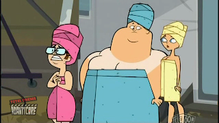 ESPAÑOL: Varios de los personajes de la serie "Luz, Drama, Acción" en toallas, antes y después de haber tomado un baño. Lamento muchísimo la presencia de Owen, el chico gordo. Nadie quiere verlo en una toalla. Capturas del episodio "Loco y salvaje oeste".